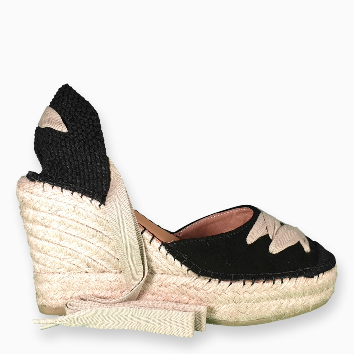 Alpargata valenciana salón fabricada de manera artesanal en España. Cuña de yute trenzado en color natural de siete cuerdas más plataforma y lazos para atar al tobillo. Pala realizada en ante con un detalle especial de cintas cruzadas y con interior en piel. Planta acolchada y forrada en piel para un mayor confort. Talonera en tela de saco. Un modelo tradicional y fácil de combinar.